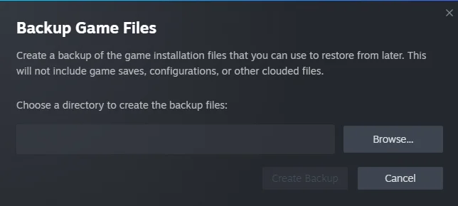 در اینجا قسمت استیم از شما آدرس برای ذخیره بکاپ که قرار است بگیرد از شما می خواهد که با کلیک روی گزینه Browse آدرس مورد نظر را مشخص و با انتخاب Create Backup شروع به بکاپ می کند. (مدت زمان بکاپ بستگی به حجم بازی و سخت افزار شما دارد)